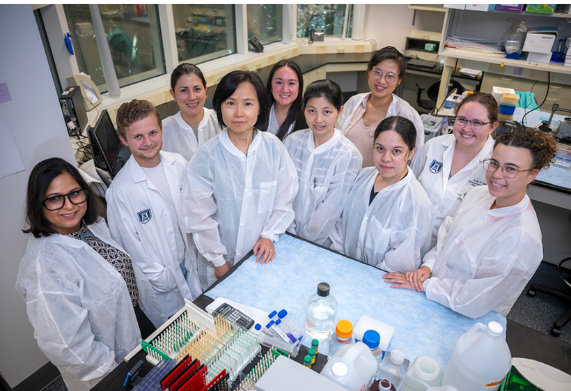 Qin Wang, MD, PhD (fourth from left), and her research team. [Michael Holahan/Augusta University]