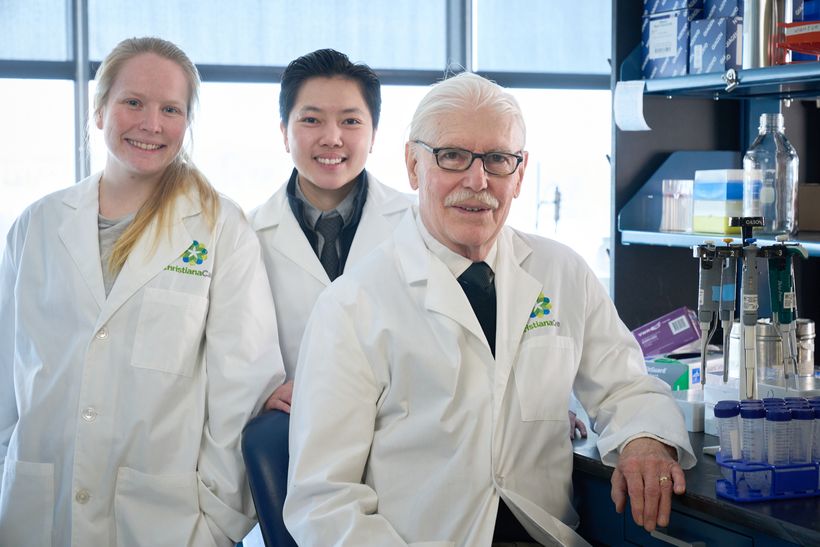 Molly Lausten, Anh Nguyen and Bruce Boman in the Cawley Center lab