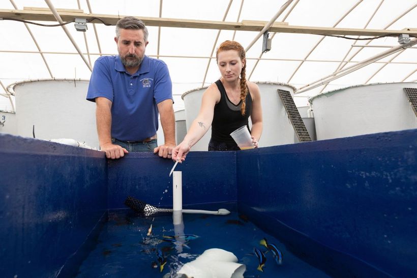 Matt DiMaggio, director of the UF/IFAS Tropical Aquaculture Laboratory, observes a student caring for blue tang fish at the Ruskin facility. Tyler Jones, UF/IFAS