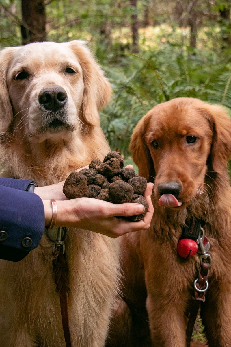 Truffle dogs Cricket and Rye stand behind their find, a cache of Leucangium truffles. Heather Dawson