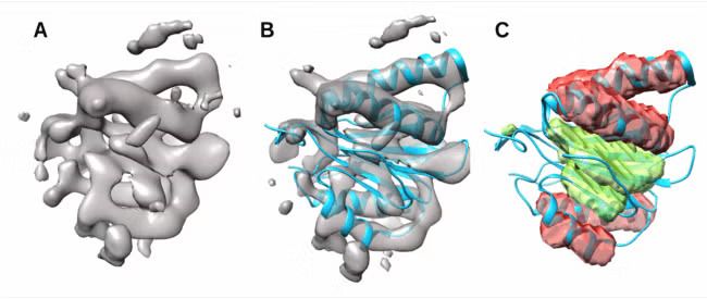 A: Medium-resolution cryo-EM image. B: Medium-resolution cryo-EM image with ground truth atomic model (blue spiral indicates a helix; blue strands in the center form the beta sheet). C: Ground truth atomic model with prediction (red shows detected helices; green shows detected beta sheets)